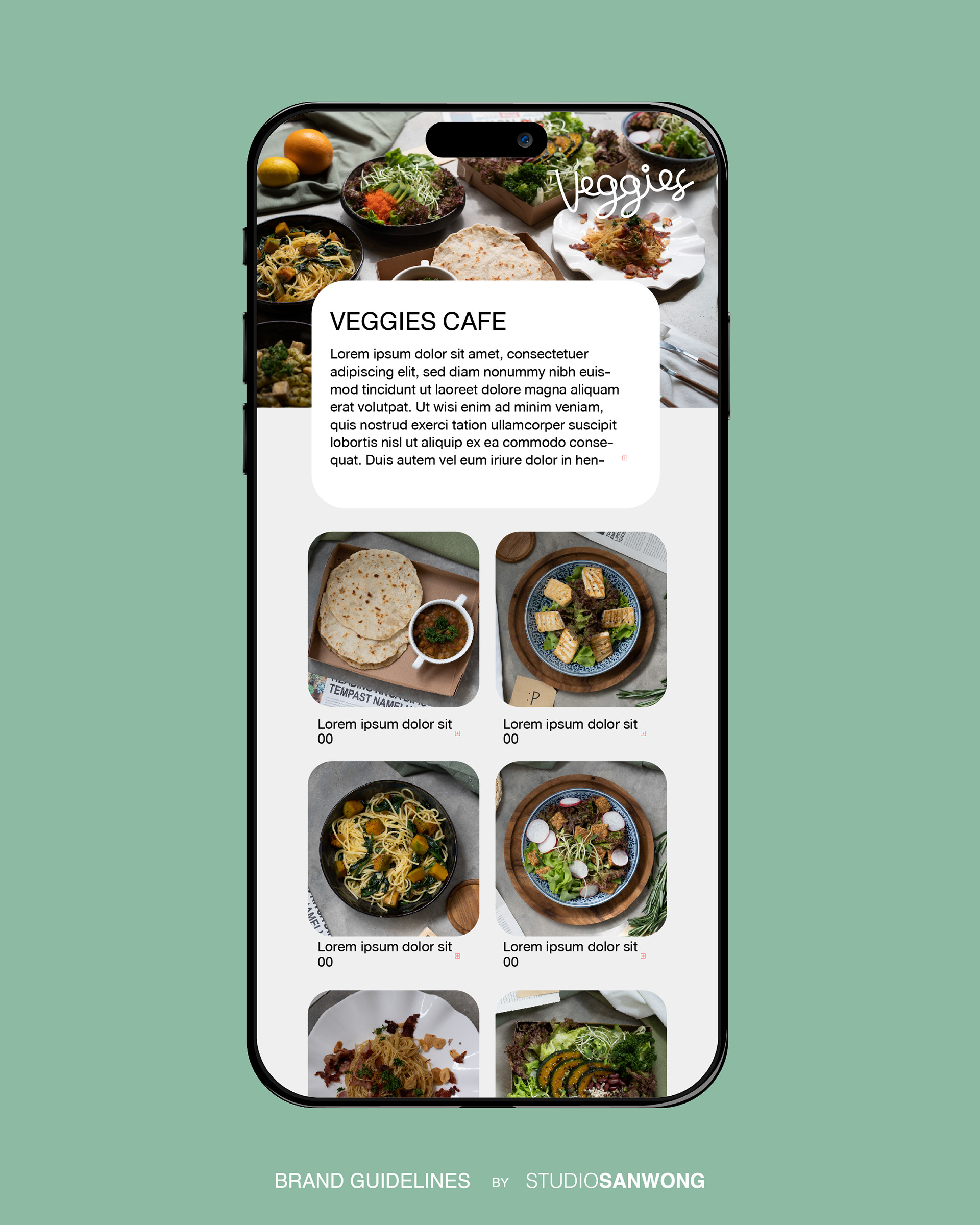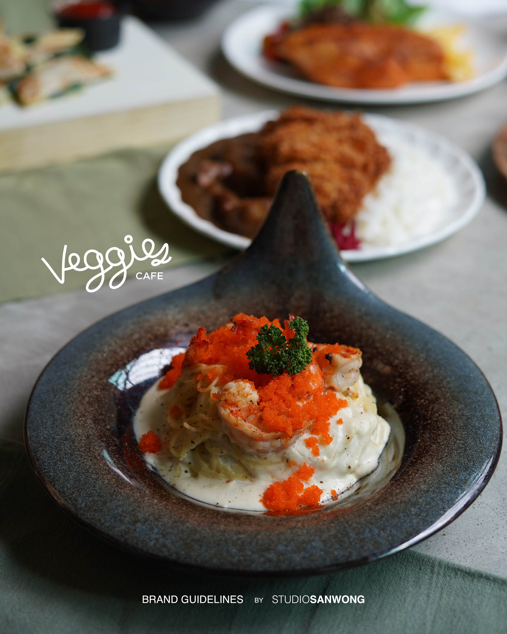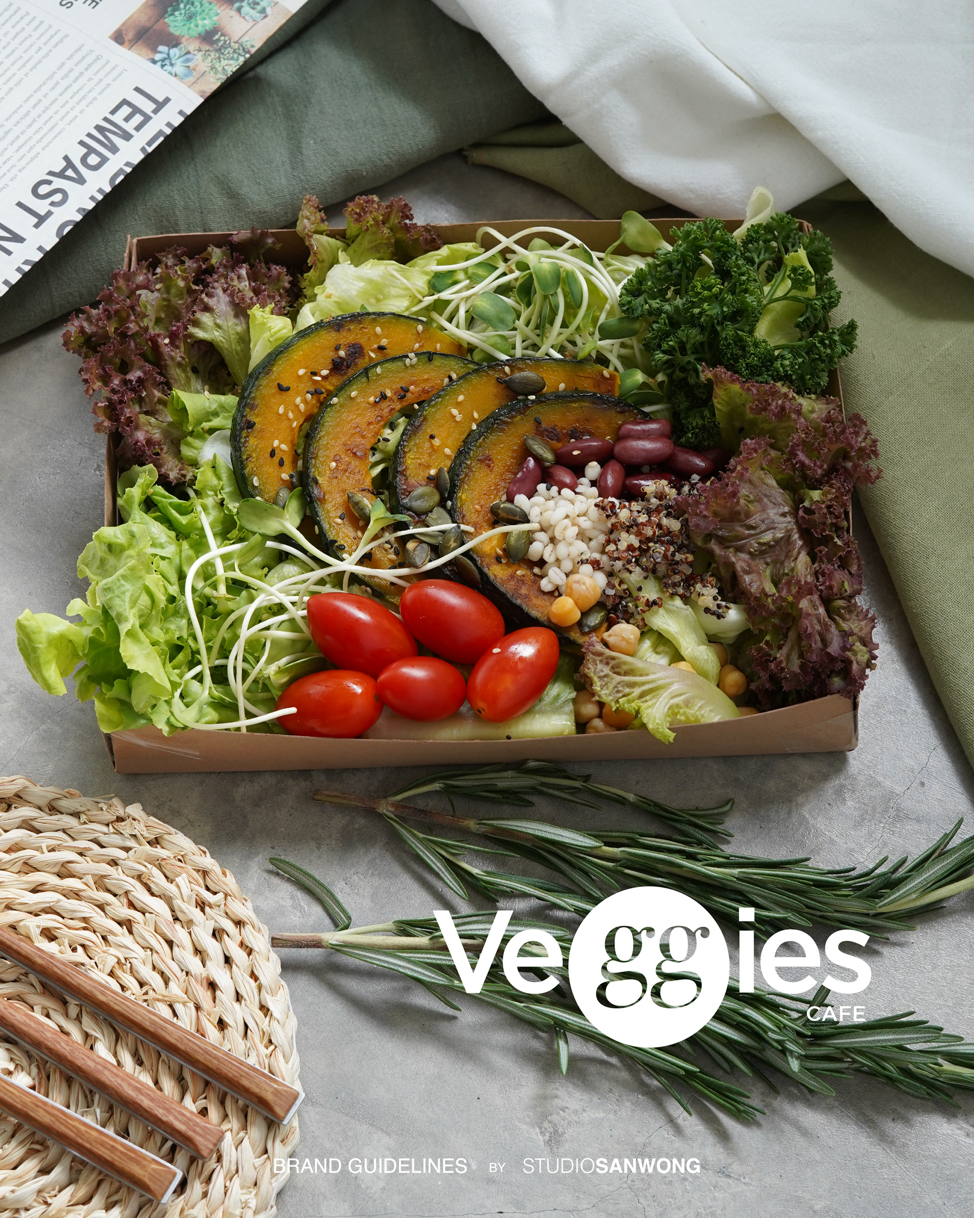 The colors used are inspired by nature, like the green of leaves, the brown of soil, or the orange of vegetables. The images highlight the freshness of the food, arranged with care. Everything you see through their graphic design simply reinforces Veggies Cafe's dedication to quality.