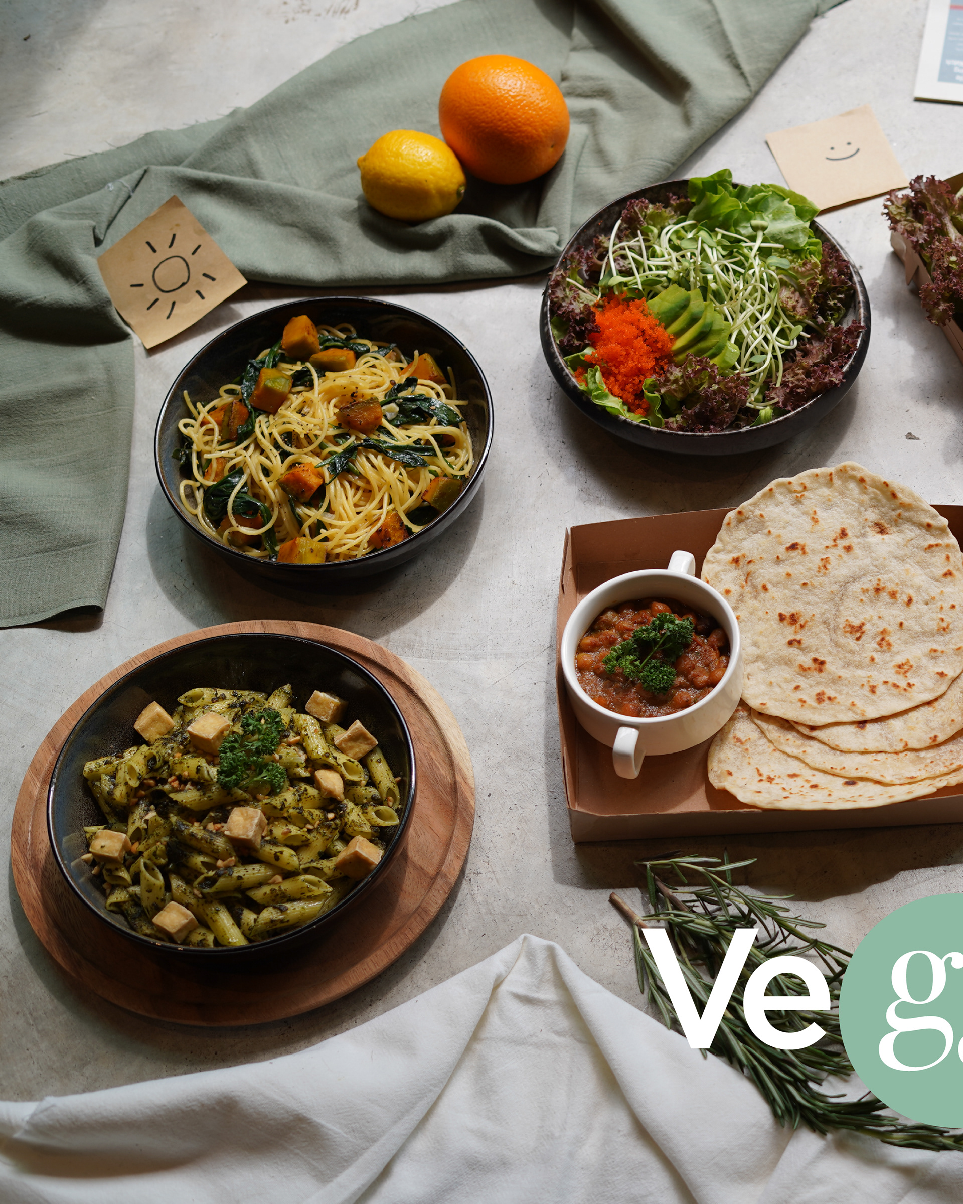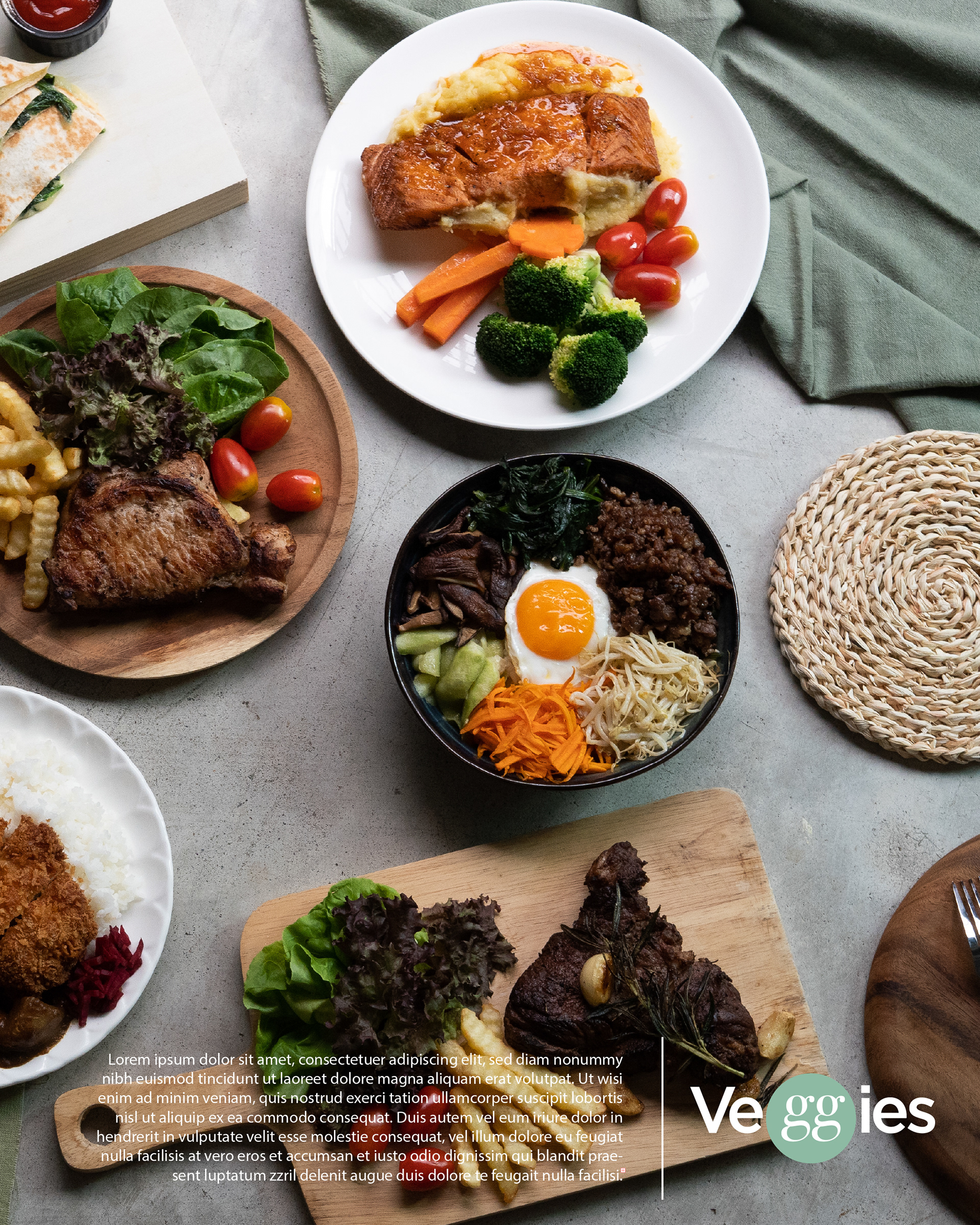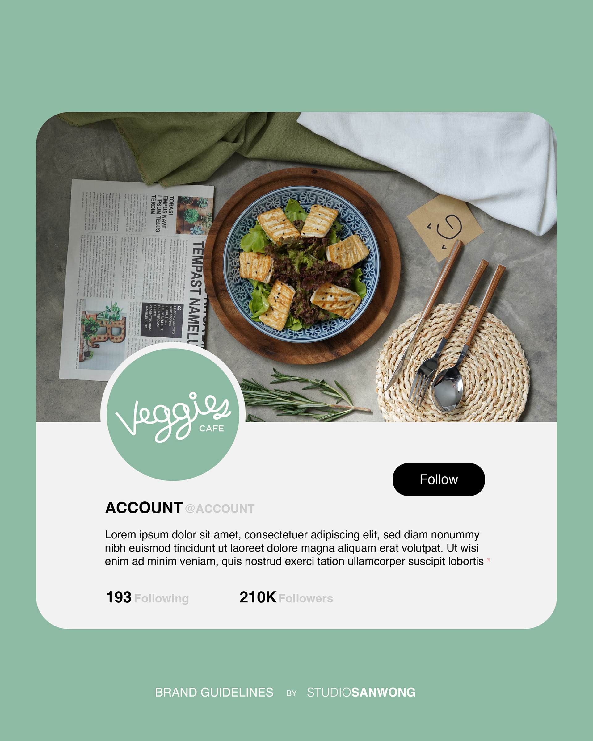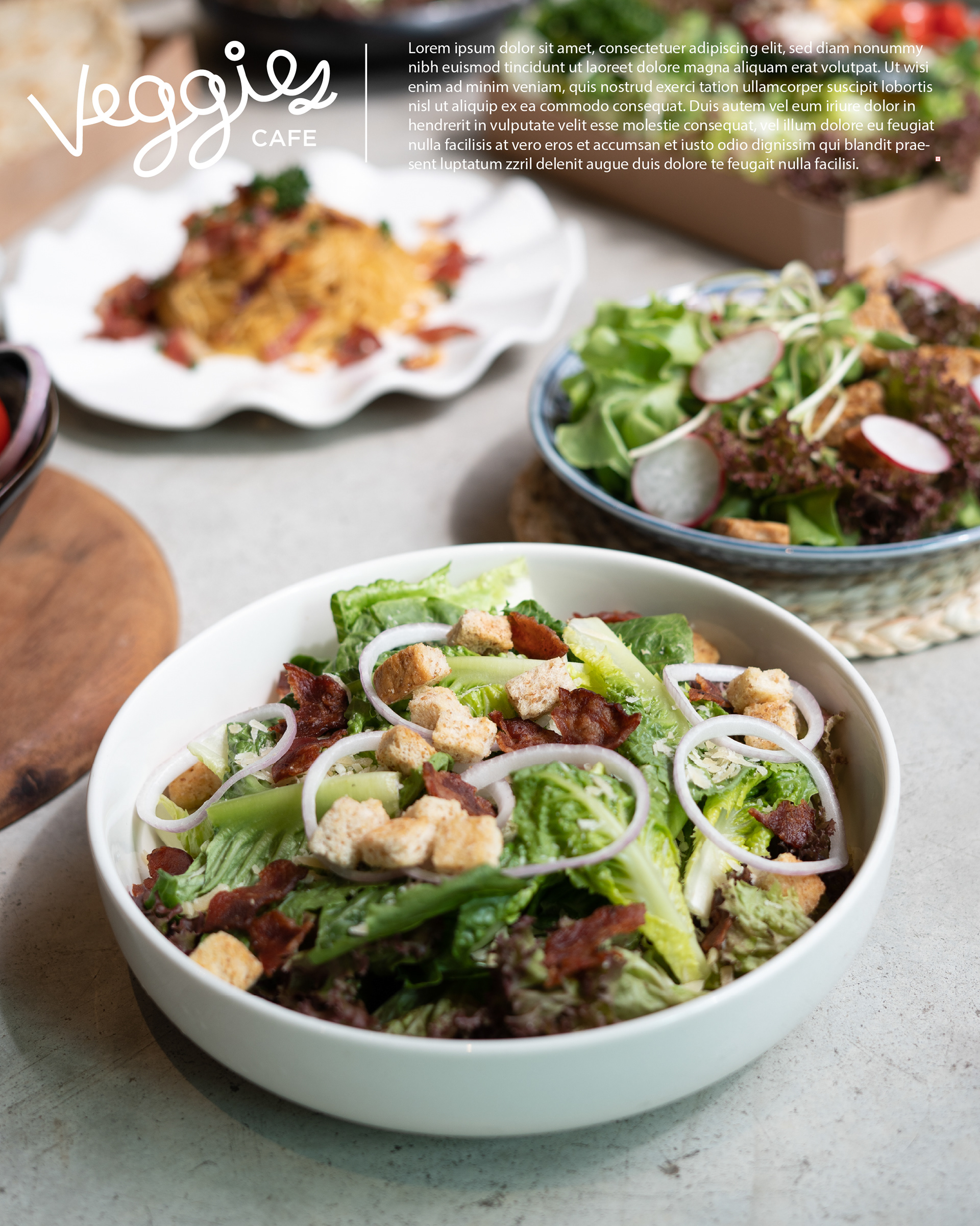 The colors used are inspired by nature, like the green of leaves, the brown of soil, or the orange of vegetables. The images highlight the freshness of the food, arranged with care. Everything you see through their graphic design simply reinforces Veggies Cafe's dedication to quality.